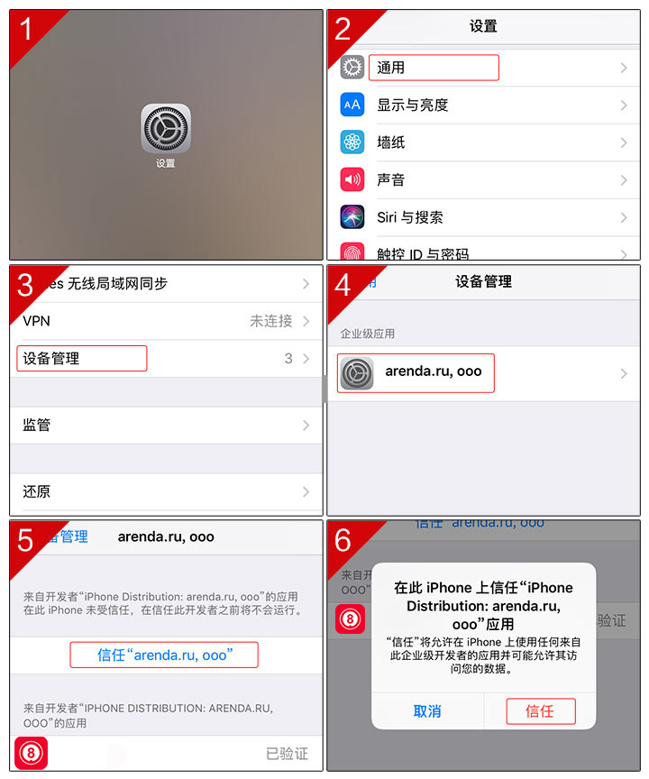 2、在手机找到「设置」—「通用」—「设备管理」—「arenda.ru,ooo」- 点击「信任」- 返回桌面点击多彩APP就可以开始使用了。
